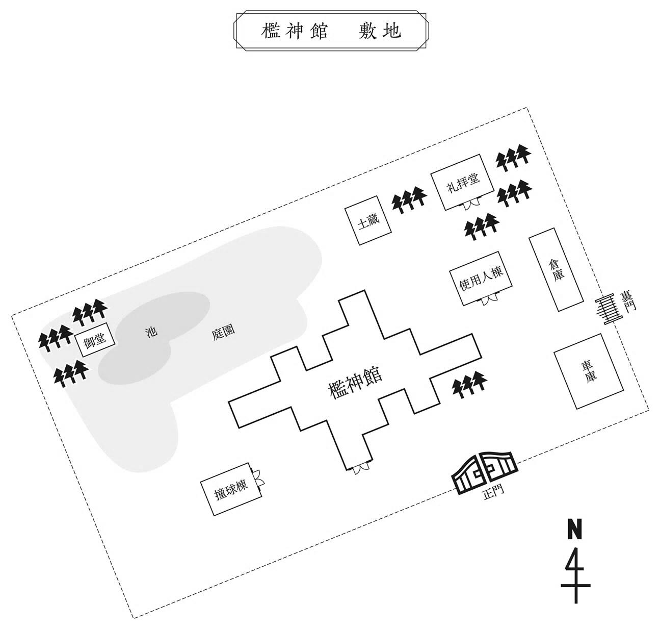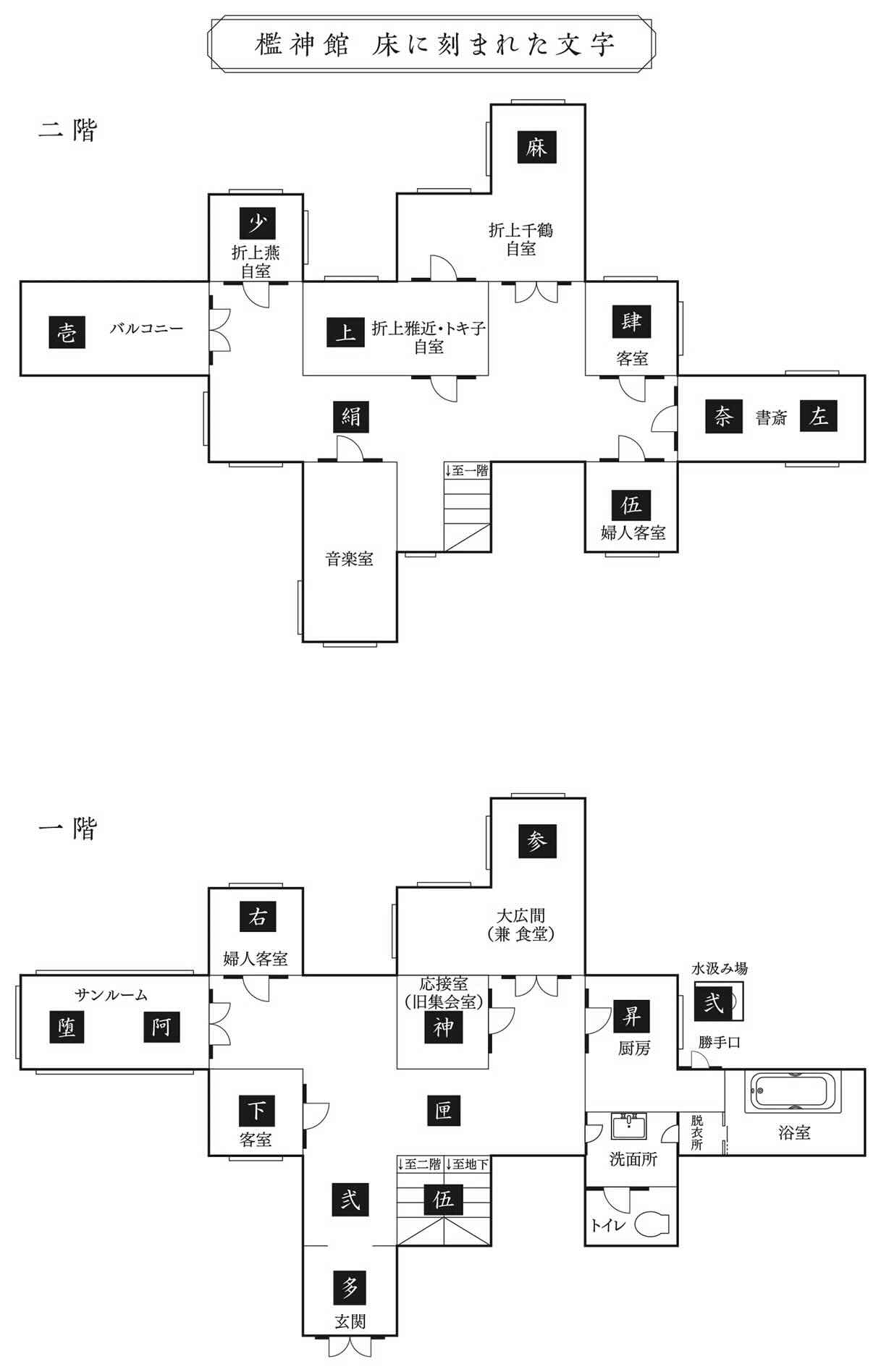 夜幕降临,絢子与黒江在后门接应迟到的綾城。黒江将记录了平面图和各房间汉字的抄本交给了他们。綾城以知晓“檻神館双胞胎的秘密”为筹码,迫使大寺执事放行。在大寺的房间里,綾城揭开了折上家族隐藏的多重深渊:鷹雄因在古书中发现孤儿院收养广告,确认自己并非亲生,绝望离家。折上家族极易诞生同卵双胞胎,初代与二代当主皆有双胞胎兄弟。双胞胎女佣玻璃、瑠璃实为雅近的私生女,トキ子为掩盖丑闻,迎合初代对纯正血统的狂热执念,默认将她们作为延续血统的“备用工具”隐藏。至于导致折上重工衰败的“大逆事件”,綾城推测是当时军方高层为了敲诈勒索而罗织的阴谋,这也解释了トキ子在丈夫猝死后,为何面对空荡的账户急切寻找财宝。綾城初步剖析,初代当主设置暗号,意在设立一道考验,筛选出“有资格的人”。