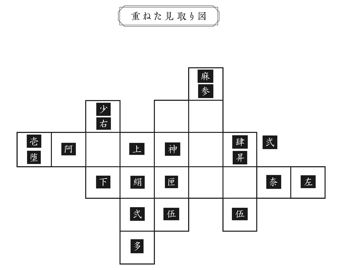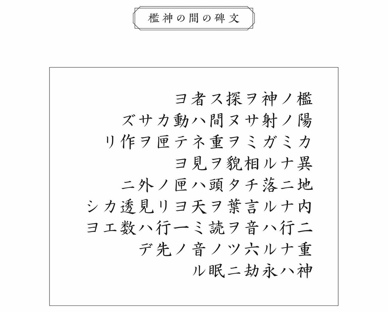 燕带着絢子与黒江潜入一楼地下通道,调查碑文暗号。她们在通道尽头的“檻神之间”意外撞见道明寺与群平密谈。两人离去后,黒江在地上捡到一枚奇怪的金属长钉,其前端呈圆锥形,尾端平坦,既无帽也无螺纹,随手将其塞进围裙口袋。房间中央供奉着一尊极其精密的黄铜双头折纸鹤雕像,台座上刻着一行白色碑文:“寻找槛中之神者。日照不入之时勿动,叠纸(众神)成神造出匣子,端看不同相貌。坠地之头于匣外,从天看透内在之语,两行读音一行计数。重叠六音的尽头,神明将陷入永眠……”絢子提议巡查全馆,将散布在地板上的 21 个汉字一一记录在平面图上。在阳光明媚的阳光房内,她们遇到了正阅读小说的表妹静子,对方态度冷淡。书房是已故当主十天前猝死的现场,据说当时尸体伏案,身上既无外伤也无挣扎痕迹。黒江在书桌上发现了一枚剪下的小块长方形空白纸屑。之后,絢子与黒江拜访了患有严重光照性皮炎、常年闭门不出的双胞胎姐姐千鶴。千鶴容貌与燕别无二致,她手持《远野物语》,犀利地指出古代村民常将通奸生子或“溺婴”罪行粉饰为神明作祟,本质不过是逃避良心谴责的借口,激动地宣称这是一种必须打破的“诅咒”。