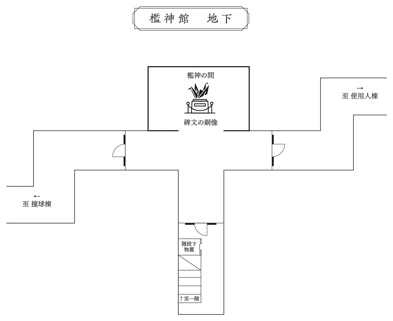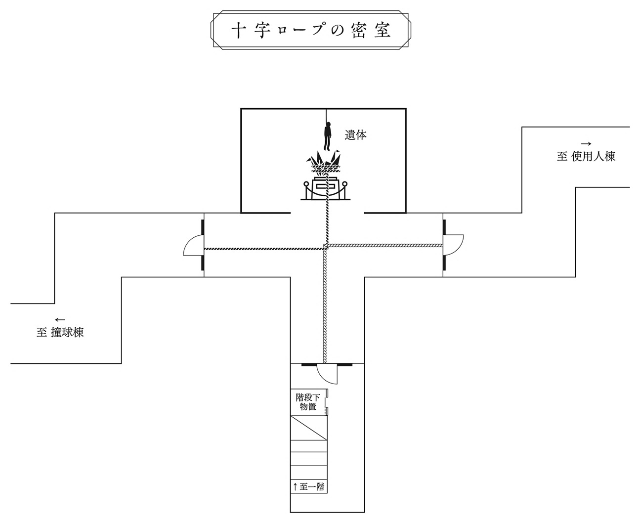 絢子在佣人栋的空房间展开推理。她意识到碑文中“叠纸(众神)成神造出匣子”的“众神”(かみがみ)在日语中正是“纸张”的同音词。将檻神館一楼与二楼平面图结合,恰好是一个长 2 格、宽 3 格、高 1 格的直方体“匣子”展开图。她将其折叠,以没有任何窗户的应接室为基准底面,观察到天面内部分布着 6 个汉字和 2 个数字。然而,当她试图结合室外废弃水泵处的“弐”字推导最终暗语时,则陷入了逻辑泥沼。晚上 9:30,絢子和綾城两人前往本馆一楼应接室,却发现トキ子并不在,只留下一张亲笔便条:“有急事,让客人等 30 分钟。”直到深夜 11 点,トキ子依然没有现身。察觉反常的众人分头寻找,道明寺带领大家走向地下通道。走在前面的道明寺突然发出一声惊呼,跟在后面的燕受惊之下踏空,扭伤了右脚踝。众人透过铁门格子窗,看到灯火通明的地下通道布置成了诡异的“十字绳索密室”。两根粗绳在地下通道的 T 字路口呈十字状交错咬合,一根连接“檻神之间”的铜像与台球栋铁门,另一根则死死扣住本馆与佣人栋铁门的内侧把手。由于三扇铁门均为向通道外侧拉开,两根绳索在三叉路口交汇处产生的巨大摩擦力,配合铜像的重量形成了稳固的合力,导致任何一扇门都无法从外部拉开,身穿和服的トキ子夫人被残忍地悬吊在天花板横梁上。道明寺提议众人分三路拉门,他自己留在本馆侧,而燕因崴脚主动要求留下。众人从三面拉倒铜像,绳索松弛,綾城割断绳子破门而入。トキ子已死,脚下倒着梯子。綾城确认遗体发现时间为深夜 11 点,尸体尚有余温,无死后僵硬,推断死亡时间在死后一小时以内,即 10-11 点之间。道明寺判断是自杀,綾城犀利反驳:所有绳结皆为死结,而且绳端极短,绝无可能从门外伸入工具打结,破门瞬间通道内确无一人,这无疑是一场完美构筑的不可能犯罪。燕悲痛过度,道明寺将她背回二楼,由黒江处理了右脚伤势。絢子注意到燕的右脚踝迅速呈现出异常严重的青紫色肿胀。担忧的絢子拿着镇静药跟去,透过门缝竟震惊地目睹道明寺与千鶴在房间内紧紧相拥。絢子返回现场,綾城向絢子和大寺出示了从死者怀中搜出的字条,上面用规整的直线字体写着:“解开了碑文之谜。关于那件事有话要说。晚上 9:30,在槛之神前等。”綾城推断凶手以此将トキ子骗出杀害。