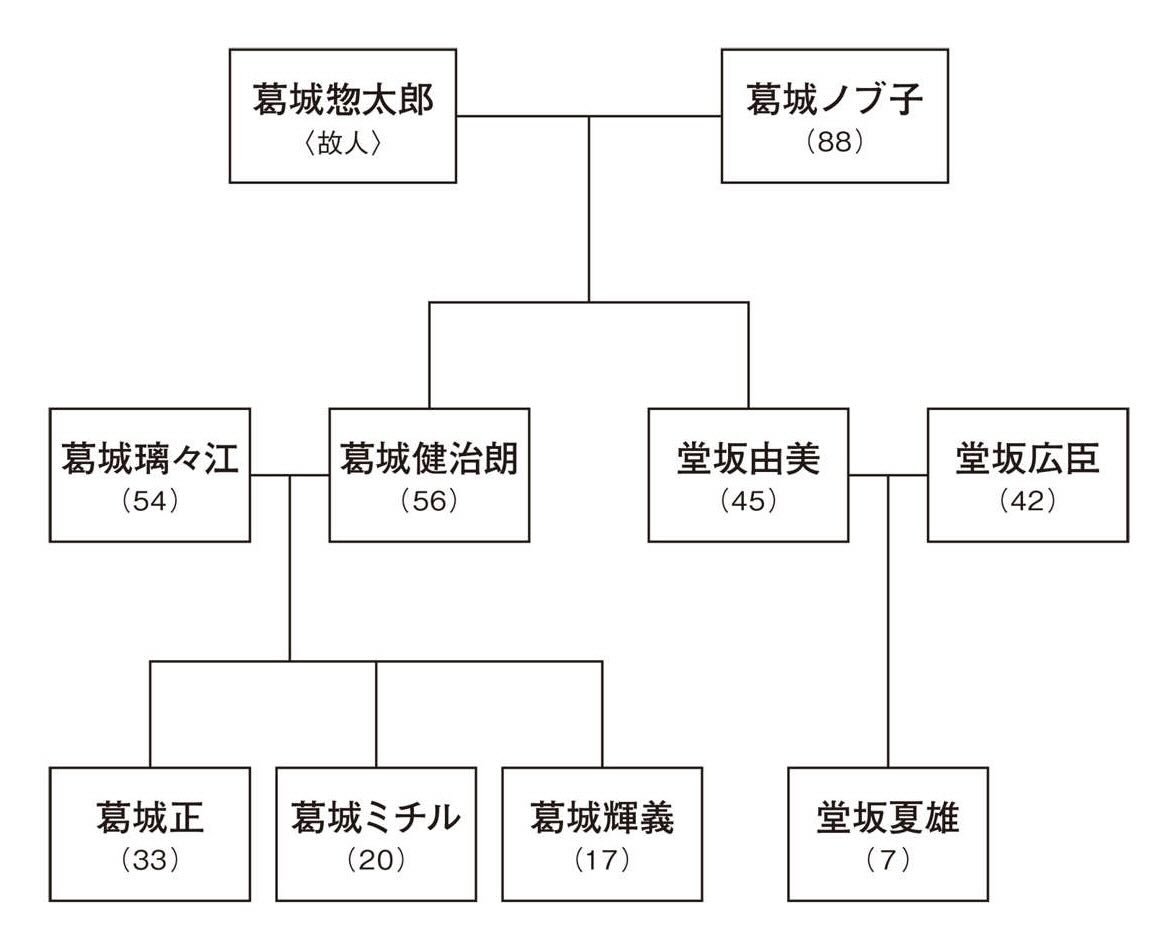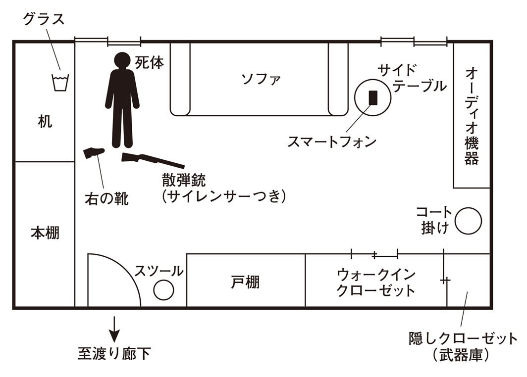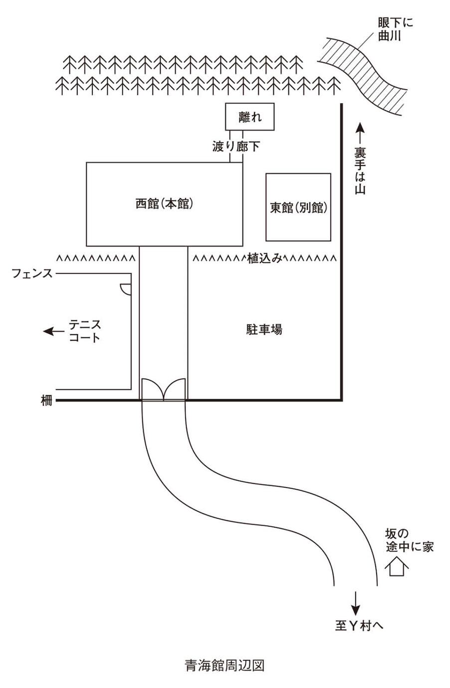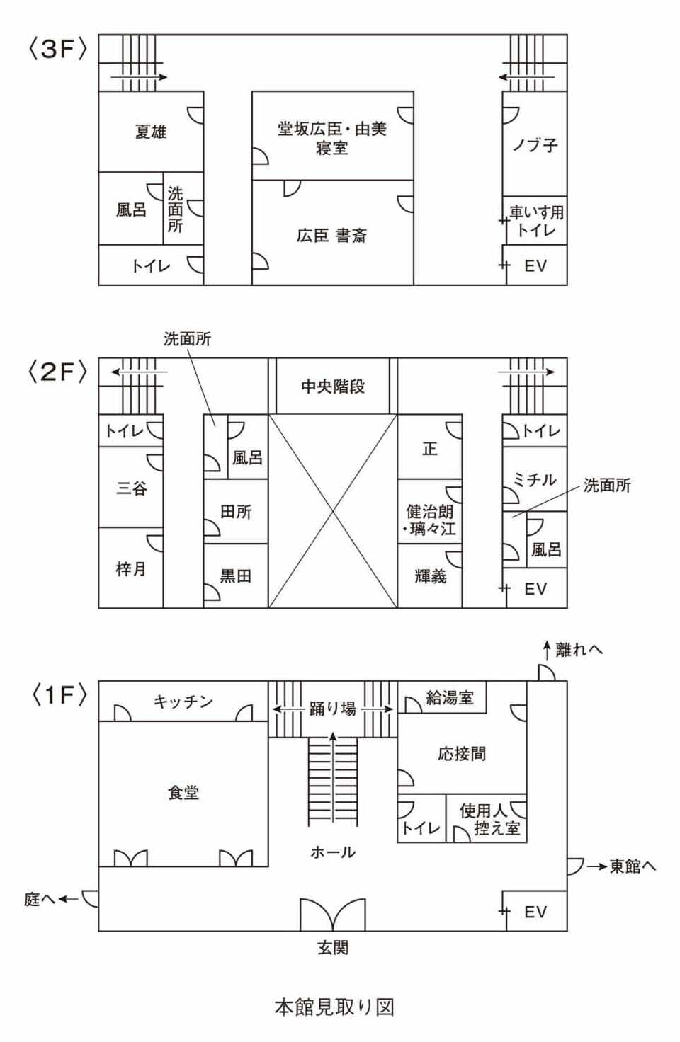 田所和三谷进入洋馆,见到了葛城家族成员:自信的政治家父亲健治朗、冷厉的物理学教授母亲璃々江、輝義的警察哥哥正、顶级模特姐姐ミチル、患有认知障碍的祖母ノブ子、姑母堂坂由美、律师姑父広臣一家。八卦记者坂口、家庭教师黒田、主治医生丹葉梓月也以不速之客的身份出席法要。期间,田所注意到正使用的是一个湖蓝色手机壳,正解释这是姑母由美送的旧物。由美抱怨家里每周都会莫名丢失高级名牌瓷盘。午餐时,气氛压抑,表弟夏雄当众指出祖父惣太郎没有死于心脏病,而是谋杀,声称目击到有人在离馆药柜前动手脚。记者坂口以此勒索,声称拍到了决定性照片。坂口宣称正被暴徒追杀,还曾被人在东京抢走相机的 SD 卡。面对下毒指控,梓月当场演示安瓿瓶折断后无法无痕复原,从物理上否定了投毒可能。