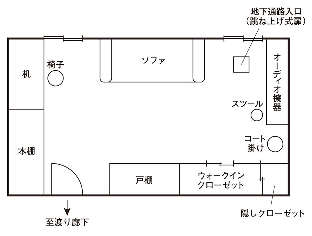 田所和三谷目睹広臣将散弹枪放回仓库。下午,大型台风登陆,引发曲川决堤风险,交通瘫痪。健治朗宣布众人留宿,坂口主动请缨入住离馆。坂口私下向两人出示了一张偷拍照,照片中一名身形酷似家族男子的背影正在操作安瓿瓶。周日凌晨 1:06,洪灾警报响起。黒田失联,坂口迟迟未现身,田所、三谷、田所的冷血亲哥哥——主治医生丹葉梓月顶着风雨前往离馆。到达门外,梓月发现玄关门未锁,锁舌被白色养生胶带贴住。室内漆黑,众人被横在门边的蓝色圆凳绊倒。借着手电筒光芒,一具无头男尸出现在椅子上,头部被散弹枪轰碎,看似脱鞋用脚趾扣动扳机自杀。健治朗指出手账中遗书的位置不合理,主张案件是他杀。真正的坂口却毫发无损地出现,称案发前已私下与葛城正交换房间。众人惊恐地认出死者衣着属于正,梓月利用尸体未僵硬的拇指指纹,解锁了现场那部湖蓝色手机壳的手机,证实死者正是葛城正。家族赶来勘查,広臣从壁橱拿出备用灯泡,让身高约 185 厘米的田所踩在 60 厘米高的旧蓝圆凳上更换天花板照明。田所不慎打碎灯泡,広臣发现原本的灯泡并未损坏,只是被拧松了。凶器上安装了広臣私藏的消音器,尸体前方地毯的放射状血迹存在一处不自然的空白断层,田所触摸发现,该处并无血液凝固的触感,反而附着着某种异样液体。管家曾目击田所和三谷傍晚返回,而且田所知晓猎枪位置,但梓月指出田所不知晓消音器,替他排除了嫌疑。健治朗指控坂口为了摆脱嫌疑,导演了落石与袭击,刻意换房。坂口百口莫辩,索性驱车离去。他在临行前向田所透露,照片里站在药柜前的人并非健治朗,而是惣太郎的“孙子”。坂口坐进红色轿车,发动引擎,车灯亮起,车身却纹丝不动。雨夜中手机铃声骤响,田所心生警兆,大喊一声“趴下”,猛扑向三谷和広臣,将两人死死按在身下。话音未落,汽车轰然炸裂,化作一团火球。田所在残骸远处的泥泞中,捡到一截断指和一块微小的手机镜头玻璃。
