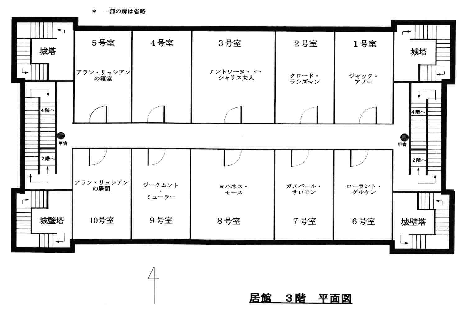 第三天,众人藏匿于三辆医药品运输卡车的冷藏集装箱内。秘书关闭了温度调节系统,车厢内并不寒冷,大家在漆黑中瞒天过海,偷渡越境,抵达了深山密林中的“银狼城”。我惊恐地发现,这座城堡的装潢陈设竟与对岸的“青狼城”如出一辙。众人换上复古服装,由 Amann 律师亲自接待。席间,我观察到 Amann 律师将手表戴在右手腕,熟练地用左手拿取餐具。蘭子设下陷阱,质问 Amann“何时变成左撇子的”,律师虽瞬间错愕,但随即承认“从小就是”。第四天(4 月 23 日)午后,众人勘查现场,未发现任何血迹,转往一楼调查 Feragut 教授的密室残杀消失之谜。幸存者 Löhse 口述称,一名头戴中世纪甲胄的凶手在图书室袭击了他,随后闯入武器室杀害教授,重伤男仆 Peter。撞开门时,两扇厚重木门均从内侧降下,插销锁死,面临断崖的窗户嵌有密集铁栅栏,凶手不翼而飞,仅留一具空甲胄。