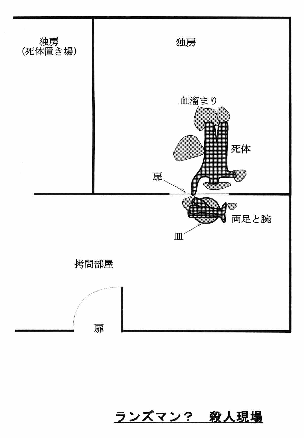 正午过后,众人转至地下一层单人牢房,调查前纳粹分子 Claude Lanzmann 的分尸密室。蘭子在调查前复述了日记细节:Lanzmann 左手戴着一枚订婚戒指,在访客抵达城堡的首日(6 月 9 日),众人曾公开讨论过这枚戒指。案发时,室内无窗,厚重木门外侧插着木闩,挂着警部自带的南京大锁。次日破门,死者头颅消失,左手从肘部切断,双腿从膝盖处斩断,背上深插一把蒙古式大刀。此刀虽无法通过观察窗,但能通过门下方的送餐口递入。门外的银盘里盛放着血肉模糊的断肢,甚至有一截断臂从送餐口伸出。