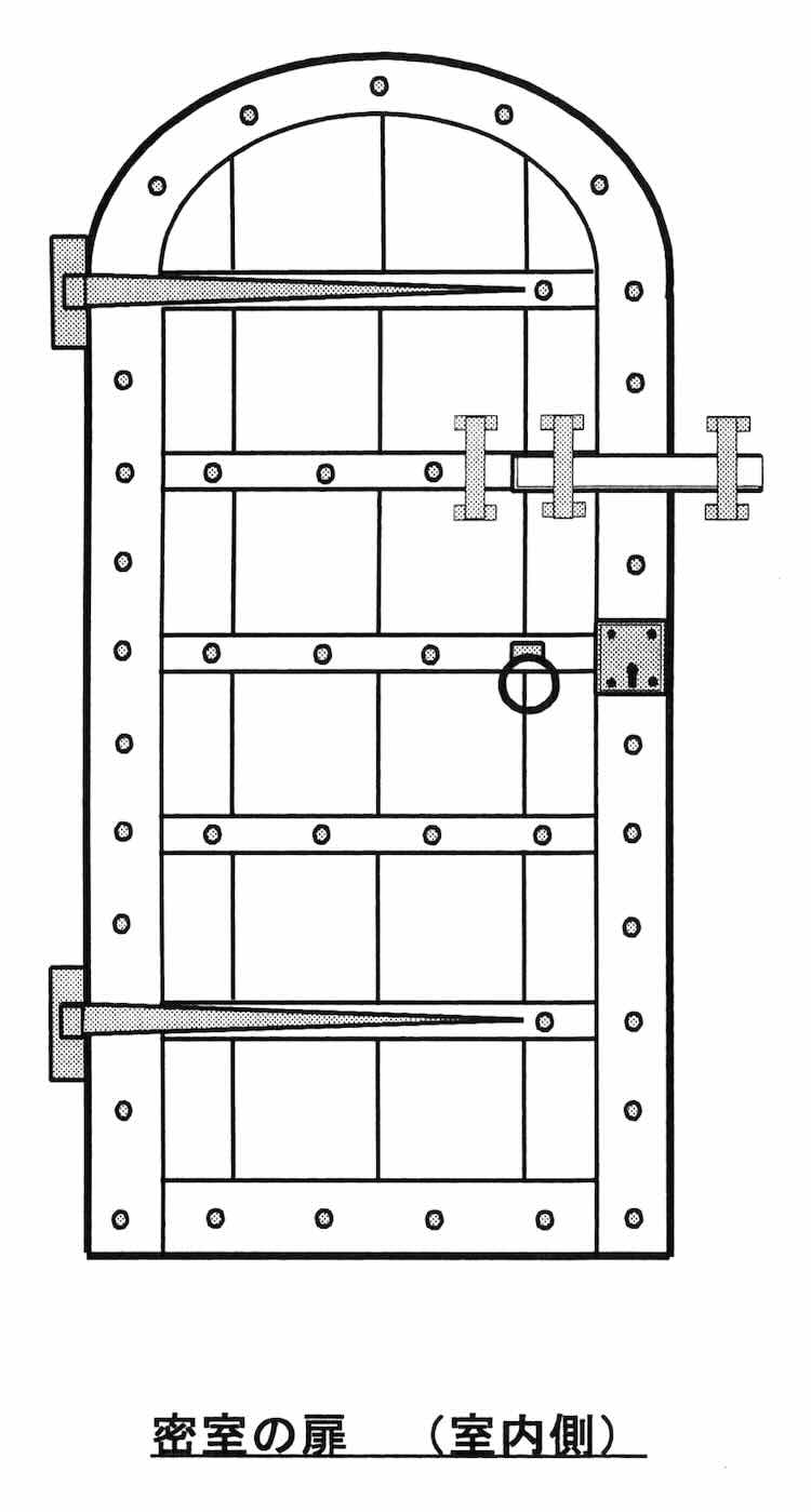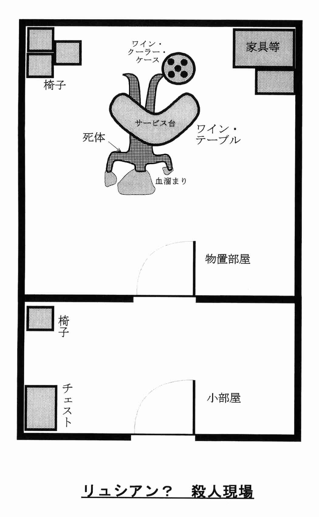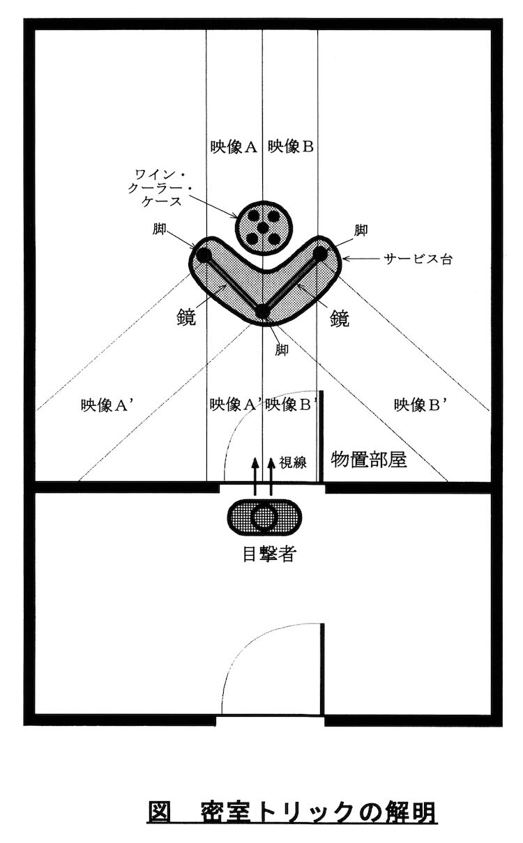 当晚 9 点,众人携带警用鉴识器材,下楼前往地下一层中央走廊西端的储藏室。途经走廊拐角时,蘭子特意留意了那套 16 世纪儿童体型的铠甲复制品,以及楼梯隔墙上饰有宗教图案的精美挂毯。我们抵达现场,仔细确认了这间毫无破绽的密室:四周石壁极厚,没有窗户,唯一出入口的两扇木门下方几乎没有缝隙,从物理上排除了外部拉线诡计。警员们利用鲁米诺试剂和铝粉进行检测,结果一无所获,地面积灰发霉的状态也证明现场没有任何行凶或清洗痕迹。为了验证凶手是否利用镜子制造“视觉盲区”,我与蘭子取来两面镜子,安置在储藏室中央那张带有圆鼓形冰酒桶的品酒桌腿之间,在入口处放置一盏提灯。实验很快失败,地下室地面的纹理拼花在反射时存在视觉差异,提灯光源在镜面上产生穿帮反光,镜子不仅极易暴露,还会导致桌后那只圆鼓形冰酒桶在视觉上凭空消失。蘭子让我们退避至对面的葡萄酒窖,独自留在储藏室内布置,随后向我们揭示了这起无头尸密室的真相。
