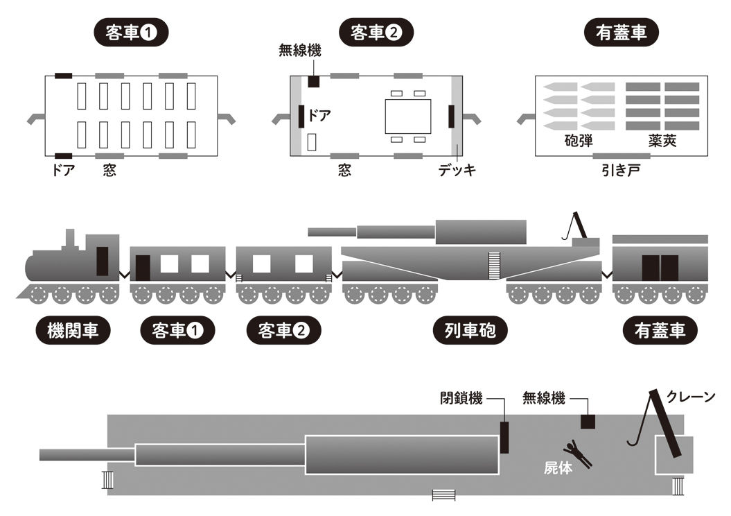 杀死花音的刀柄上刻着“いおり庵”,凶手“狐”是満島蛍,她和小笠原是异卵双胞胎,一样有杀人动机。満島在第一天就杀死了花音,尸体临时藏在吊顶上,打算日后处理,也没顾上取走刀子。第二天余震引发大石滚落,吊顶坍塌,连同尸体一起掉到小屋一楼(伏线:尸体下方有压碎的糖果)。満島杀死雷蔵后,不是利用两座塔之间的水平传送带,而是用缆车的方式从高处运送尸体到铜像上方(见下图)。満島修改原稿,诱导雪絵触发断头台机关。