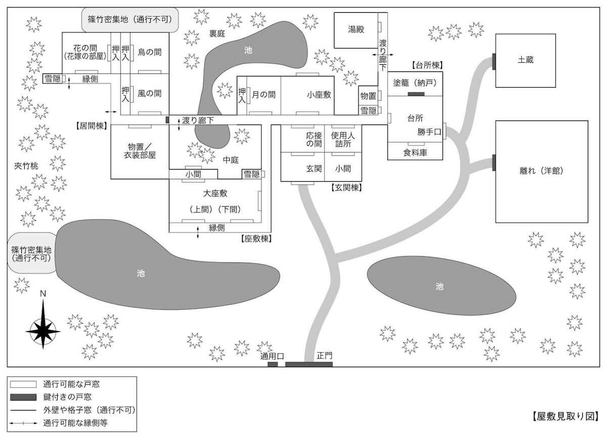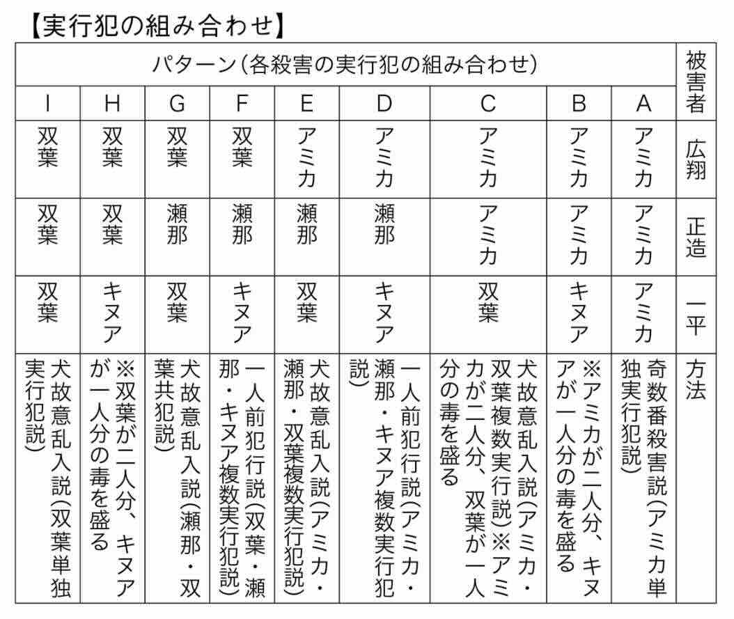 聯指出,死者发病时间高度同步,游街期间未曾进食,加之日程临时提前一小时,延迟发作的手法无法精准契合交杯酒时间,受害者摄入砒霜的时机必定是在交杯酒仪式期间。聯排查毒药失窃过程:前天下午瀬那外出时屋宅无人,原计划晚归的三名女眷却因突发意外,相继提前回家,有充足时间解开密码锁。防犯摄像头排除了外人,中庭走廊已被新娘上锁。聯接着排查下毒环节:录像显示,愛美珂饮酒时发出啜饮声。由于座位间隔较远,瀬那和絹亜需起身递酒,途中因脚步摇晃,手掌覆压杯缘,从而产生了涂毒机会。双葉在狗乱入时。从上方护住酒杯,新郎表兄橘翠生则在案发后单独介护死者。絹亜当众挑衅,瀬那足袋染有粉色酒味花瓣,迫使众人怀疑她前天曾去过石祠。