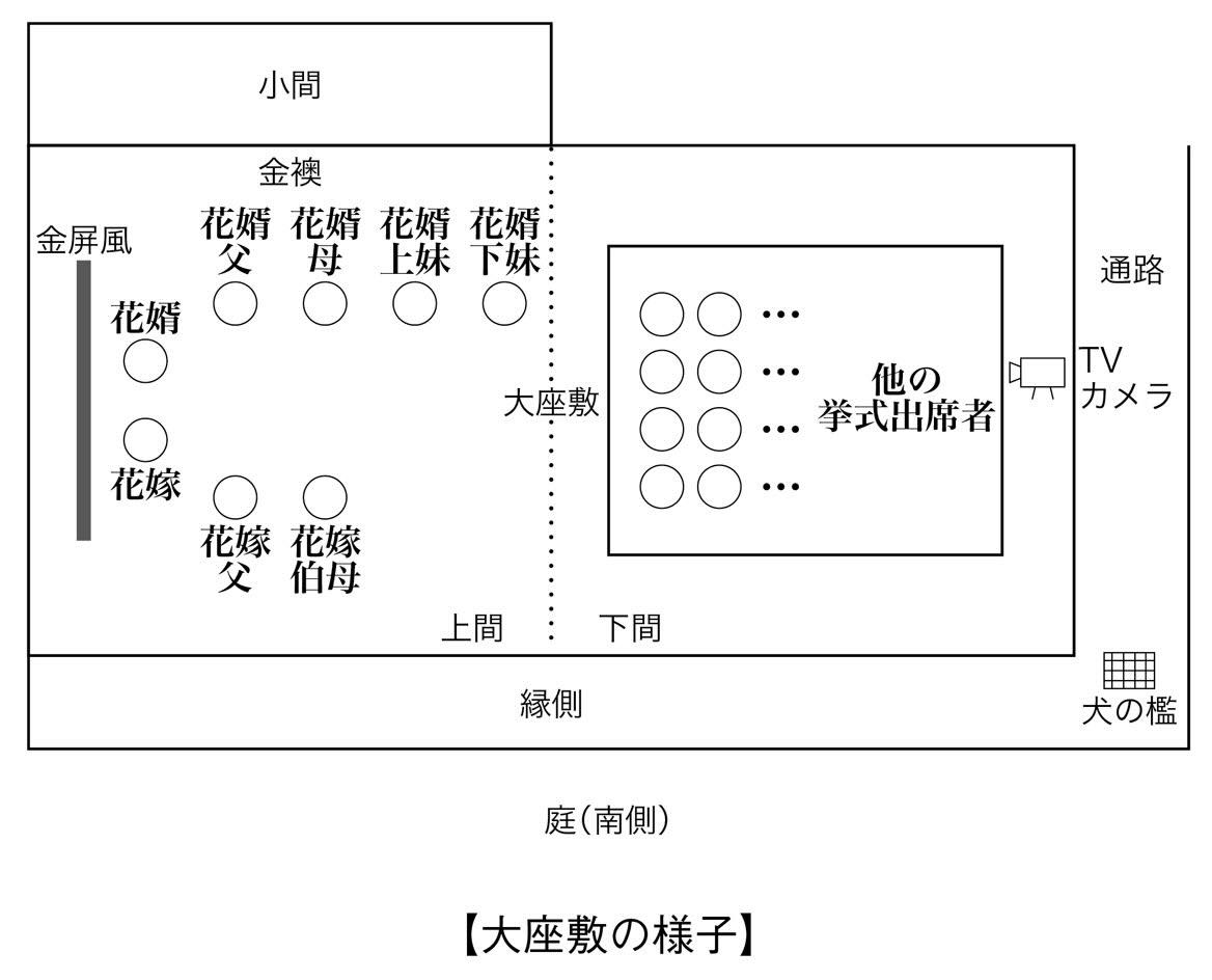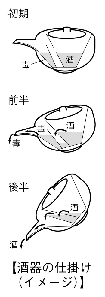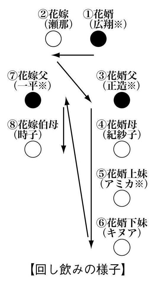时间回溯至婚礼当日清晨。在俵屋家客房,伴娘双葉好奇试戴绵帽子,遭新郎的大妹妹愛美珂刻薄训斥。下午 1 点,日程提前 1 小时。依当地“七夜考”习俗,瀬那已在男方家住了整整 1 周。为履行从娘家出发的游行仪式,她不得不应愛美珂的要求,先锁好通往客房的走廊大门,从男方家返回娘家。她无视了趴在榻榻米上履行“下跪”仪式的一平,向脚踝扭伤坐着轮椅的伯母致意,随后出发。抵达俵屋家大座敷主会场后,愛美珂嫌弃伯母带来的衣服,强行让瀬那换上了借来的昂贵樱粉色留袖和服。交杯酒仪式开始,众人轮流共饮同一只大酒杯。双葉生疏地将酒注入带有升龙浮雕的黑漆大酒杯中。瀬那注意到,瀑布口处的龙尾浮雕形成了一个易积污垢的凹陷。新郎広翔率先豪饮,之后递给瀬那。瀬那小口啜饮,因脚步摇晃,险些洒出,急忙用双手捏住杯壁前后缘,稳住酒杯递出。酒杯依次传给新郎父亲正造、母亲紀紗子、大妹妹愛美珂、小妹妹絹亜。传到絹亜时,小狗“ムギ”突然挣脱笼子,直冲向酒杯。絹亜恶作剧般让狗舔舐杯中酒,然后捧着沾了狗口水的酒杯递给新娘父亲。一平因欠俵屋家巨款,公司又仰仗对方生存,性格变得卑微至极,不敢拒绝任何刁难,顺从地将残酒一饮而尽。不久,広翔、正造、一平三人接连倒地痉挛,剧烈呕吐身亡。傍晚在医院候诊室,瀬那发现左脚白袜被带有酒味的液体浸湿,染上了淡粉色,还粘着一片粉红色的夹竹桃小花瓣。