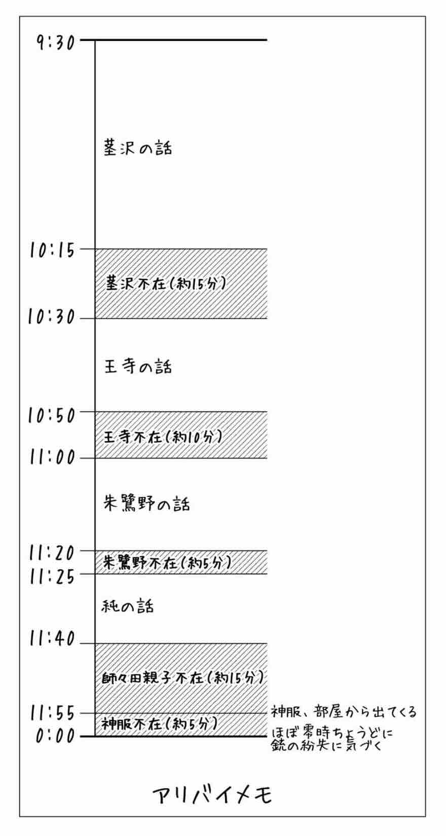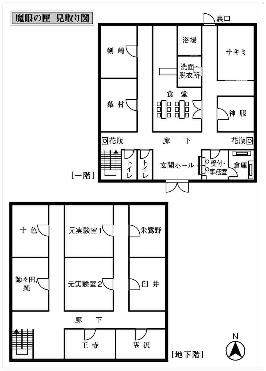 回到建筑,躲在暗处的比留子现身。她要求录像见证,重新勘察朱鷺野的尸体,指出其后脑伤口处的血液已有生活反应,已结痂凝固。她发现朱鷺野从不离身的智能手机不翼而飞。比留子检查了王寺房间四角用图钉固定的剥落壁纸,又在師々田房间锁定了毫无卷曲痕迹的通灵板。搜查完毕,比留子当众宣告真相大白,要求 3 小时后在食堂进行最终审判。
