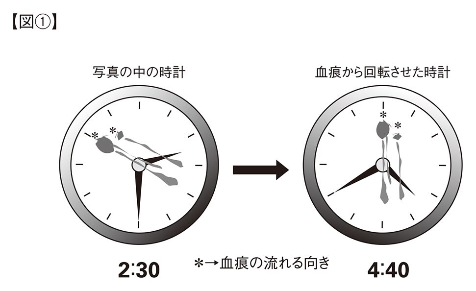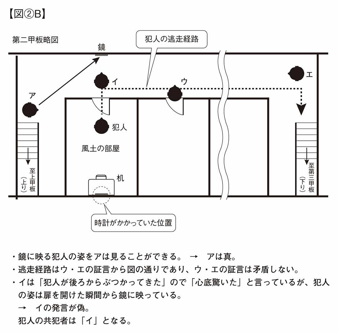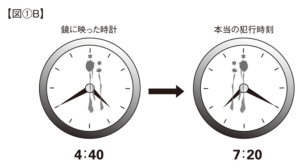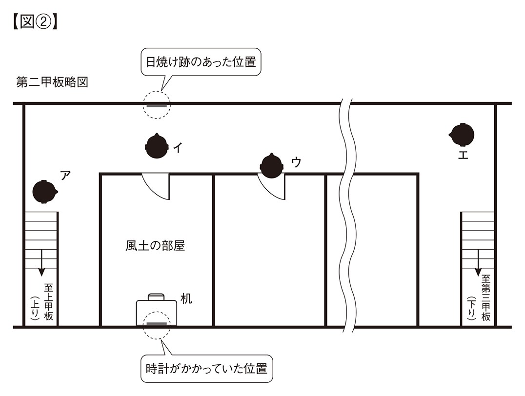 【マサル】晚上 8:30,マサル坐在 A 甲板食堂解第一题,推断推理作家风土玲流的遇害时间。下午 5:58 的开场视频交代了背景:小说家在船内被玻璃烟灰缸砸死。视频结束后,穿燕尾服的男子强调“绝对禁止下船”,要求将最终答案“犯人是谁”投入投票箱。スグル不慎打翻果汁,弄湿了カイト的套件,工作人员随即为カイト换了一套新题,上面印着他的全名“猪狩海斗”。晚上 9 点,マサル前往第二甲板走廊尽头的案发现场。他留意到外墙有一块长 60 厘米、宽 30 厘米的日晒痕迹,显得格外突兀。现场的假人死者趴在书桌上,头部流血,手压原稿纸。墙上挂钟只剩下一圈圆形痕迹,旁边贴着一张照片,显示挂钟指针指向 2:30。マサル注意到照片表盘上的血迹向右下方倾斜,而重力作用下血迹理应垂直向下。他向工作人员借来量角器,将照片旋转至血迹垂直的角度,重新计算出指针实际指向为 4:40。