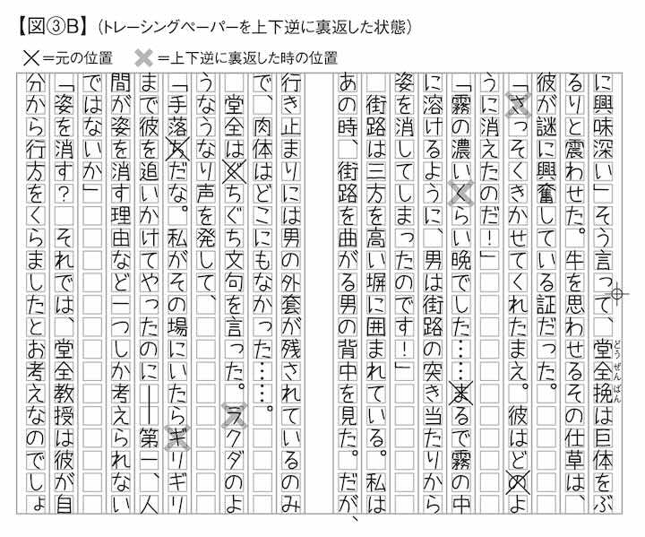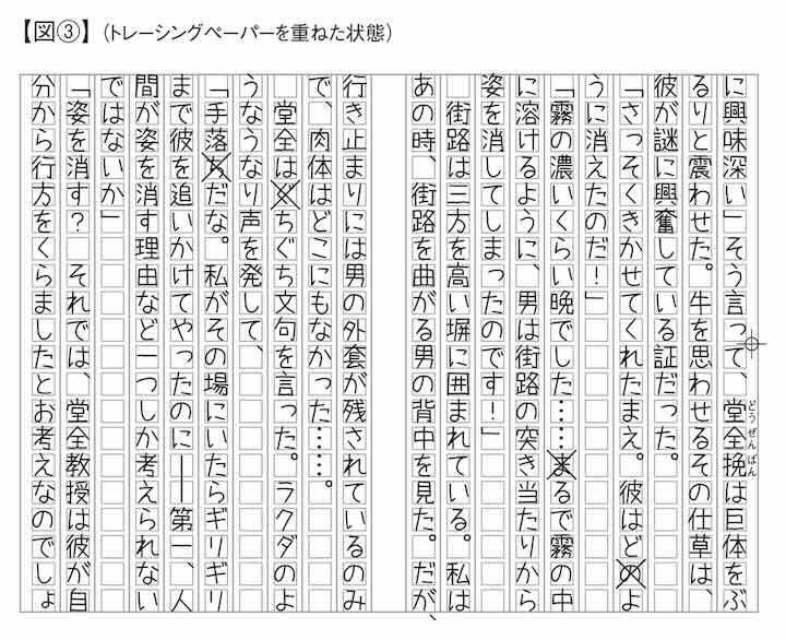 【マサル】次日清晨 6:10,マサル开始解答第三题。提示要求“将圆圈置于眼角旁,若见人名即为答案”。他手中是一张绘有小圆圈与四个大叉的半透明描图纸。思索片刻,他意识到“眼角”实指死者未发表原稿纸的格子边缘。因照片模糊,他折返案发现场确认,果然在原稿纸右侧边缘的方格内,发现了一枚微小的圆圈印记。将描图纸上的圆圈对齐后,四个大叉恰好透出原稿纸上的四个平假名——“のまぐち”。マサル回到大厅交卷。