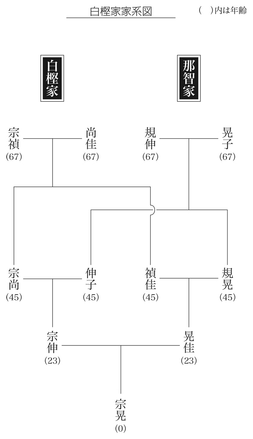 【安城則定】采访结束后,暴风雪封山,安城与烏有被困在宅邸 2 楼的居间内。刚下班的白樫宗伸回到家中,晃佳则邀请安城去音乐室听琴。安城在琴声中将白樫家系图与身世反复比对,察觉家族成员名字均严格遵循从父母名字中各取一字的“八字规律”(宗、禎、尚、佳、规、伸、晃、子)。生父規晃(Nori-aki)的“规”读作“Nori”,生母禎佳(Sada-ka)的“禎”读作“Sada”,组合起来正是“Norisada”。养母当年听到的呼唤声在汉字上对应的必然是“规禎”,而非她随手拟写的“則定”。据此,安城推断出自己的真名正是规禎,即那智夫妇失踪的儿子,也就是眼前晃佳的亲弟弟。安城掏出银戒指摊牌,晃佳见状,神色惊恐万分,在安城的步步紧逼下,她终于承认曾有个叫规禎的弟弟,含泪哀求安城宽限至明日,届时定当和盘托出真相。