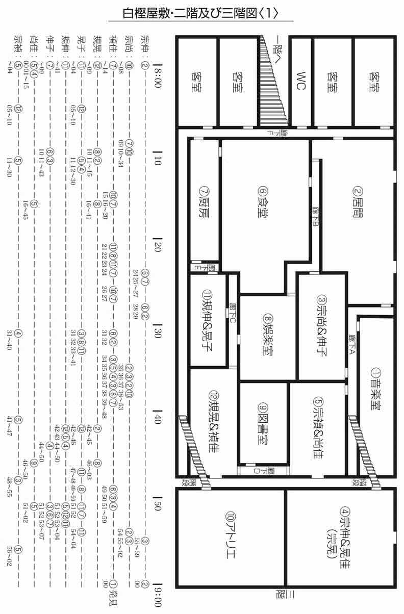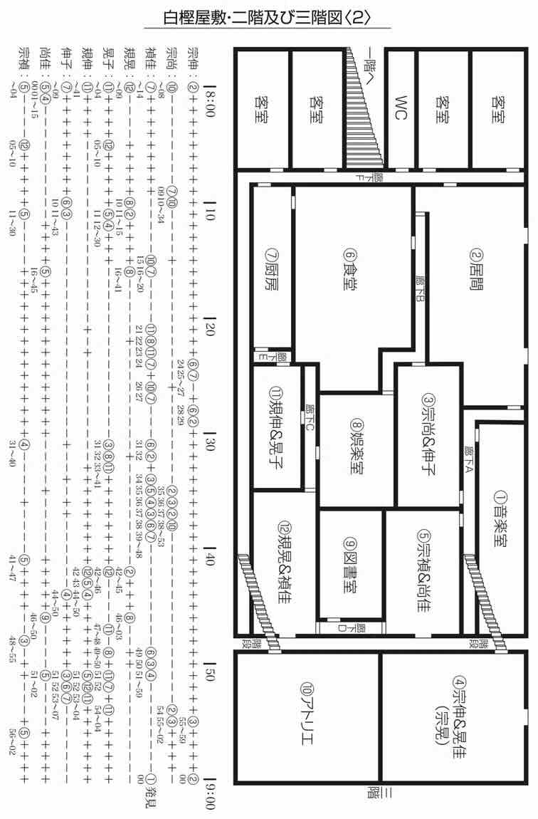 【如月烏有】如月烏有在狭小的公寓内死磕时间表,构想出那智禎佳充当“隐形人”潜入二楼音乐室的诡计,却发现她从未有过连续 12 分钟的空档。随后他又提出“分段切首法”,即利用零碎的不在场证明空档,分多次完成切割动作,将白樫宗禎及其妻子尚佳代入推演,发现搬运尸体必然会撞见走廊上的家属。最后,他将目光锁定在拥有近 50 分钟独处时间的白樫宗尚身上,但对方若从三楼画室前往二楼音乐室,必须经过有人停留的厨房,在物理空间上完全行不通。