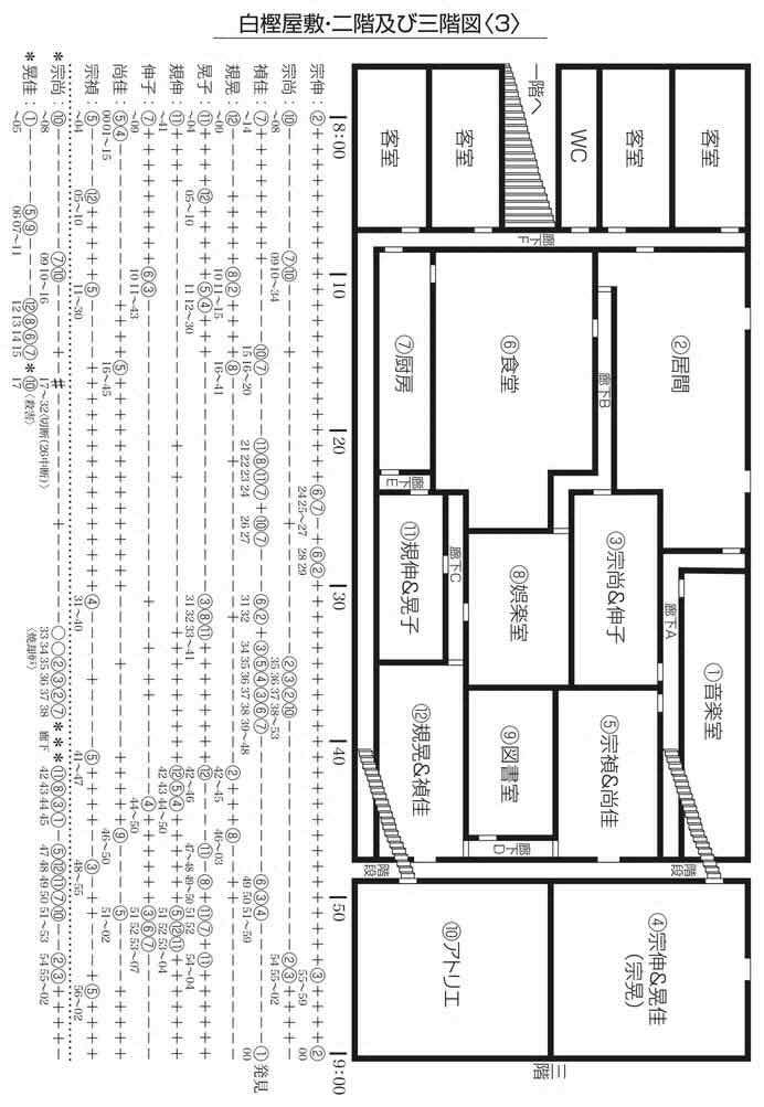 【如月烏有】二楼居室内,宗伸为了解释父亲隐居深山的信念,正向烏有狂热地阐释白樫一族的创世神话,断言“光”已降临,一切早已开始。大雪封山导致两人无法下山,宗伸提议留宿。晃佳的母亲那智禎佳邀两人 6:45 前往二楼食堂共进晚餐。烏有注意到,宅邸各处的房间与走廊里,都悬挂着精确到秒的大型红色 LED 数字钟。宗伸带着烏有、安城前往三楼卧室,探望肤色苍白的婴儿宗晃。卧室内立着一座巨大的玻璃圆锥神坛,内部嵌套着倒圆锥,正是家族标志的立体呈现。晚上 7:30,众人用餐完毕回到二楼,而宗尚始终闭门不出,独自待在三楼画室。8 点整,面容憔悴的晃佳独自走向二楼深处的音乐室。其间,宗尚曾将宗伸叫走几分钟。直至 9:00:35,宅邸深处传来一声凄厉的惨叫,众人循声赶去,只见那智禎佳瘫软在音乐室门外,浑身颤抖。推门一看,晃佳的头颅已被斩下,端正地摆在钢琴键盘上。