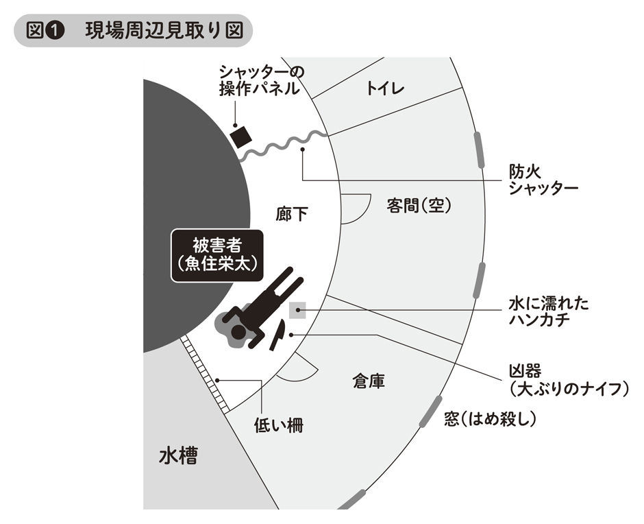 【石動戯作】石動谒见社长,听取案情,习惯性地递上名片。当年他出征归国后隐居古堡,因弟弟居住的本城武器库失窃了传家宝剑,母亲、弟弟及 9 名亲属随从闻讯赶来。案发时,他关上那扇无锁扣的木门,像往常一样单手抚摸天平铜板,低头冥想,不料宝剑竟从背后刺穿心窝,众人闻声破门而入,构成了完美的密室惨案。